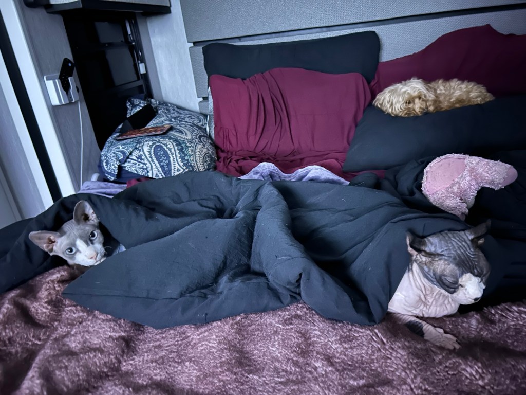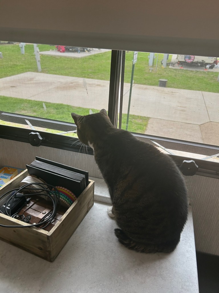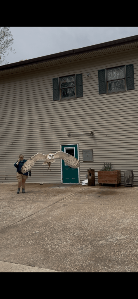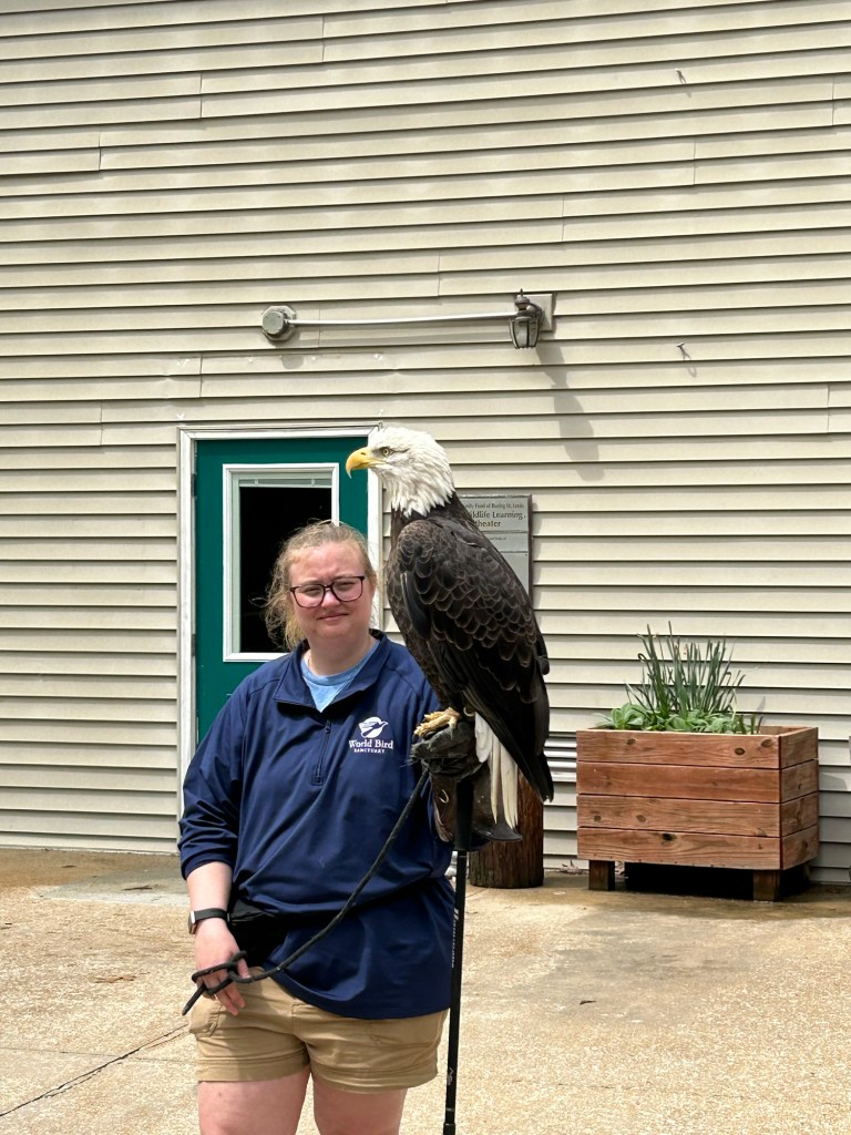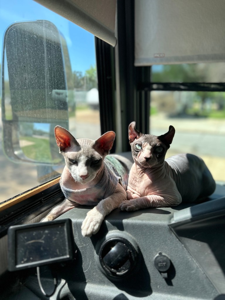 Hi everyone!! It was a nice week for us. Brittany had a full weekend off for the first time in a while so we were able to just relax together which was really nice! It’s been getting sunny here so the cats have been living it up in the front of the RV soaking in as much sun as they can get. Preparing for the next contract which is in Albuquerque!! JackJack has been blowing his coat so I gave him a good brushing, to help him along, and Darcy wasn’t sure exactly what I was doing but he wanted to help clean his brother. On Sunday we went back to the bird sanctuary here and got to see their raptor show! We met an American Kestrel named Cricket, a Vulture named Cash, a Barn Owl named Minerva, and a Bald Eagle named McGuire. As big as that eagle looks he’s only 10 lbs which is around 4 lbs smaller than Darcy.